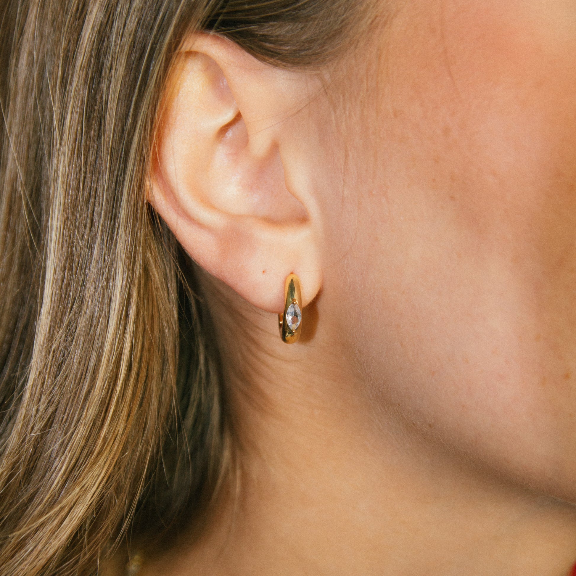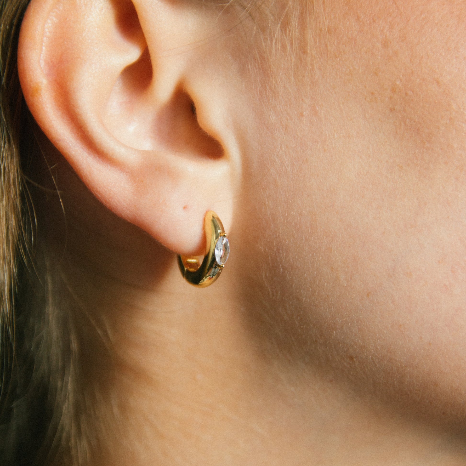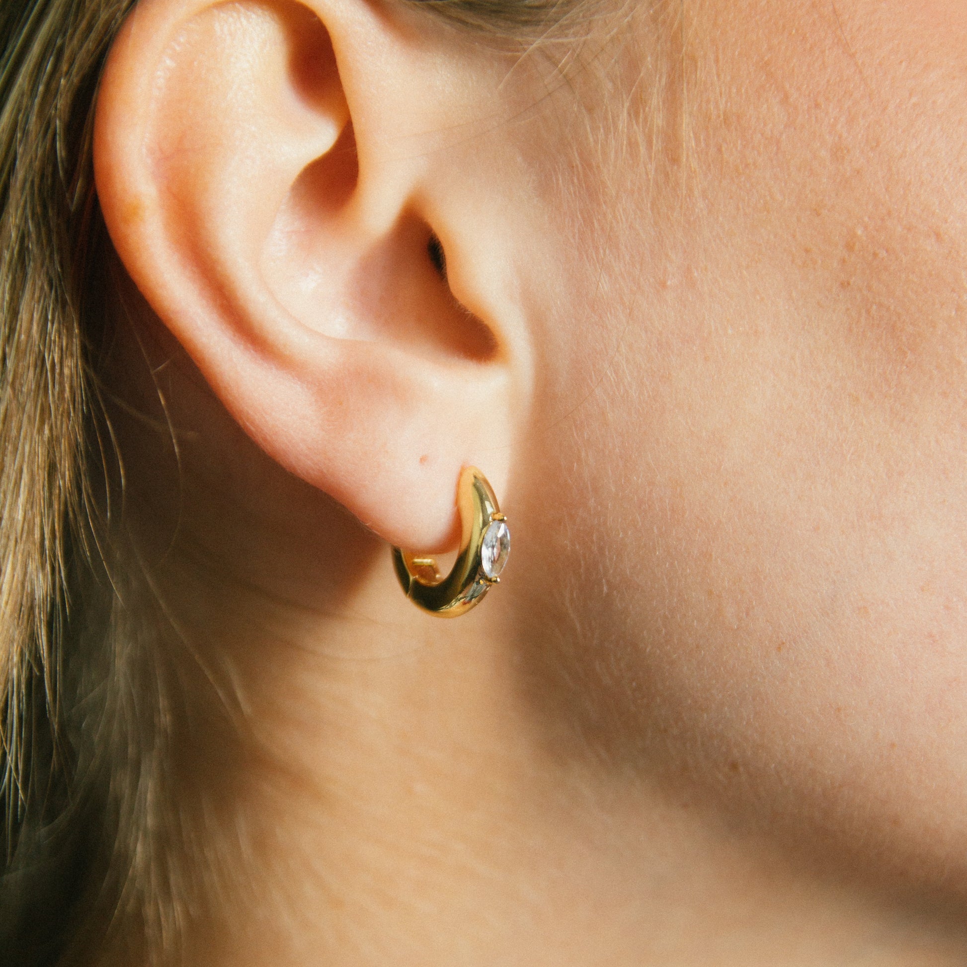 -chunky gold hoops with a marquise CZ set on the front of the hoop!