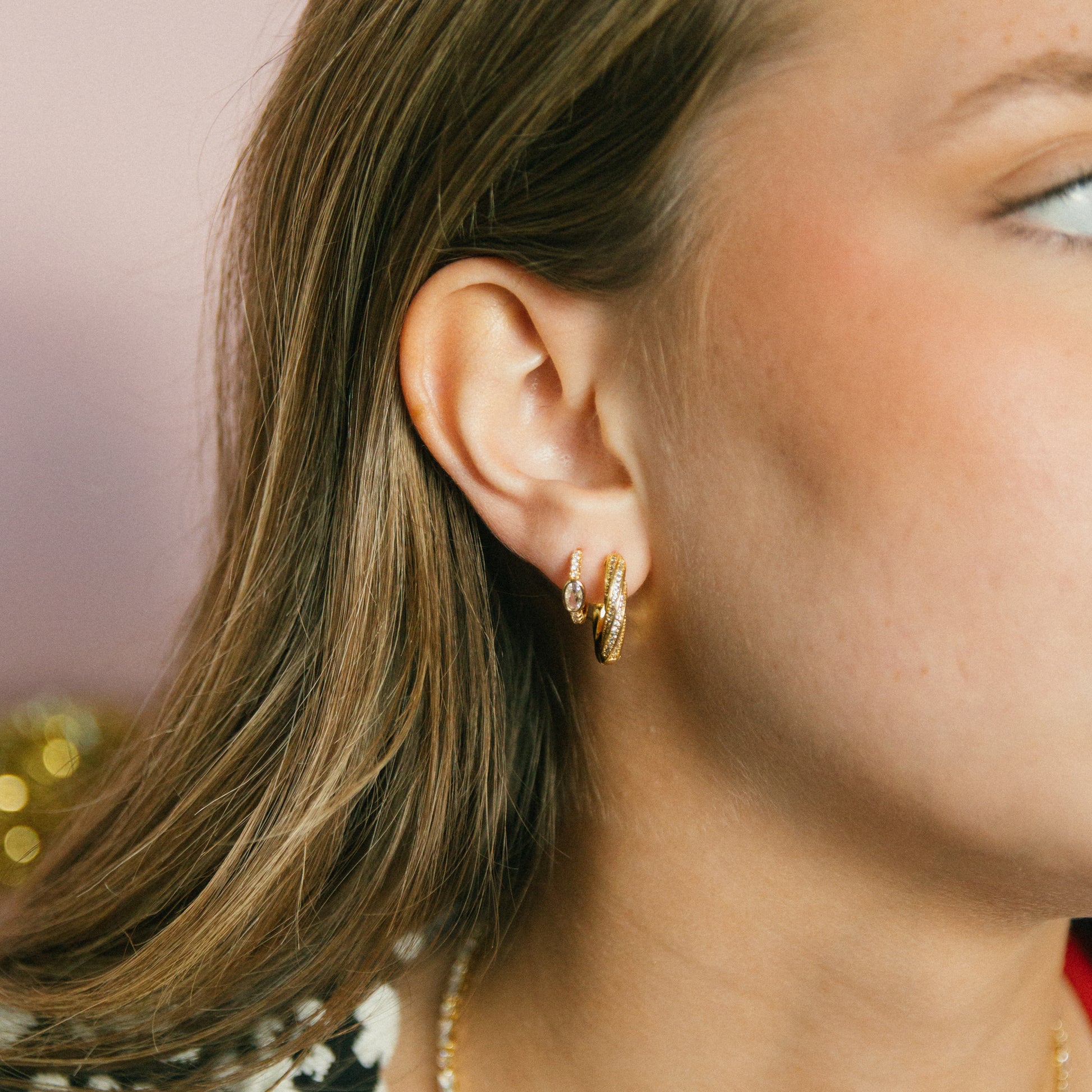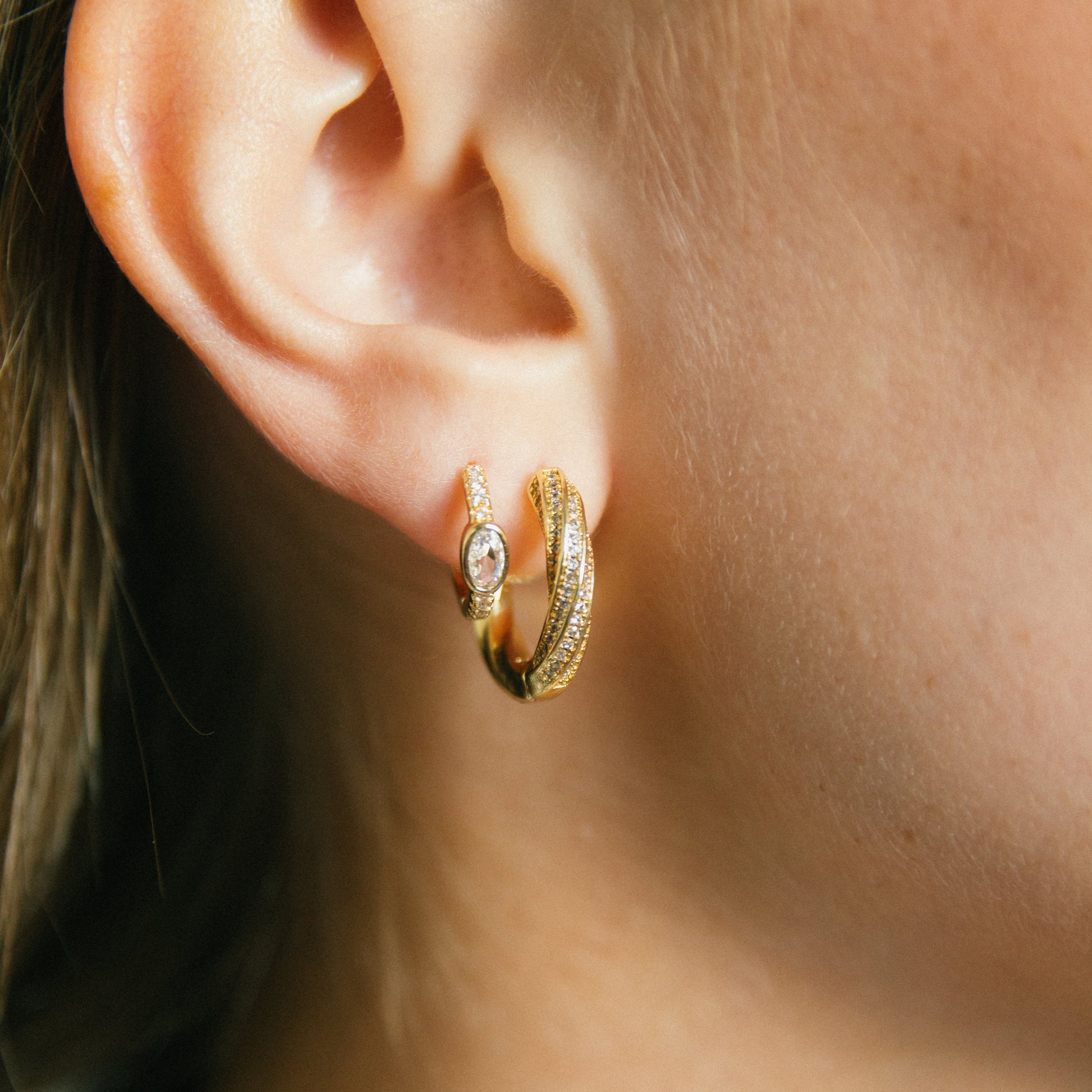 -twisted hoops with clear CZs inlaid and small huggies with Clear CZ details!