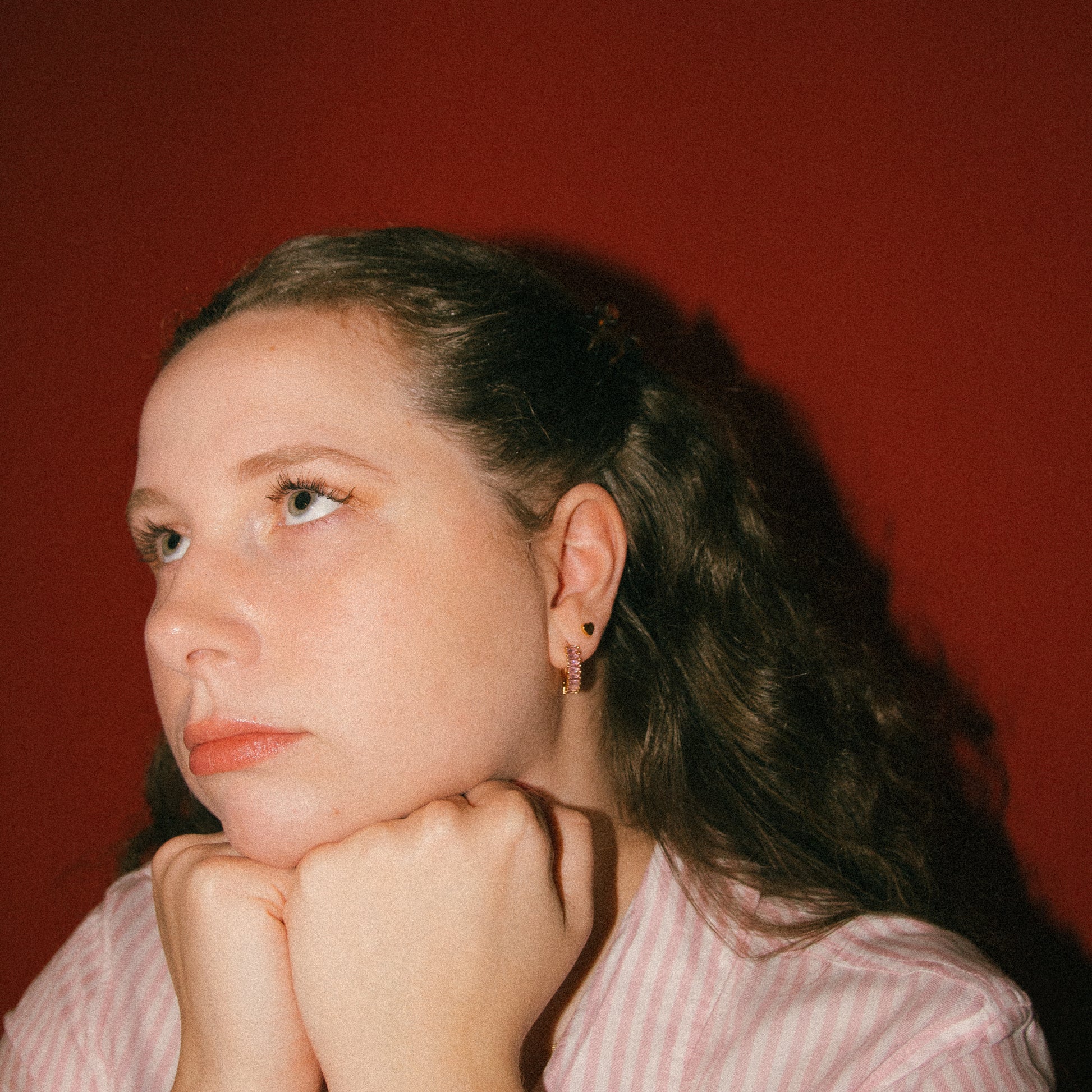 -the prettiest chunky hoops lined with pink baguette CZs and tiny minimal gold heart studs